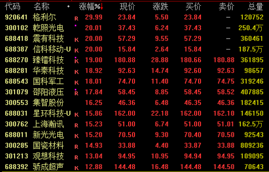 全A超3900股飘红,逾110股涨停。AI应用概念爆发,易点天下、昆仑万维(维权)20%涨停,星环科技创历史新高;商业航天概念热度不减,中国卫通尾盘涨停创出新高,臻镭科技(维权)、理工导航、航天电子等均创新高;有色板块强势,云南锗业、厦门钨业等涨停;创新药概念拉升,前沿生物、泓博医药等涨停。值得注意的是,锋龙股份(002931)斩获11连板,鲁信创投11日收获9板,志特新材(300986)连续5日20%涨停。